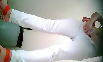 Asian woman in white pants pissing